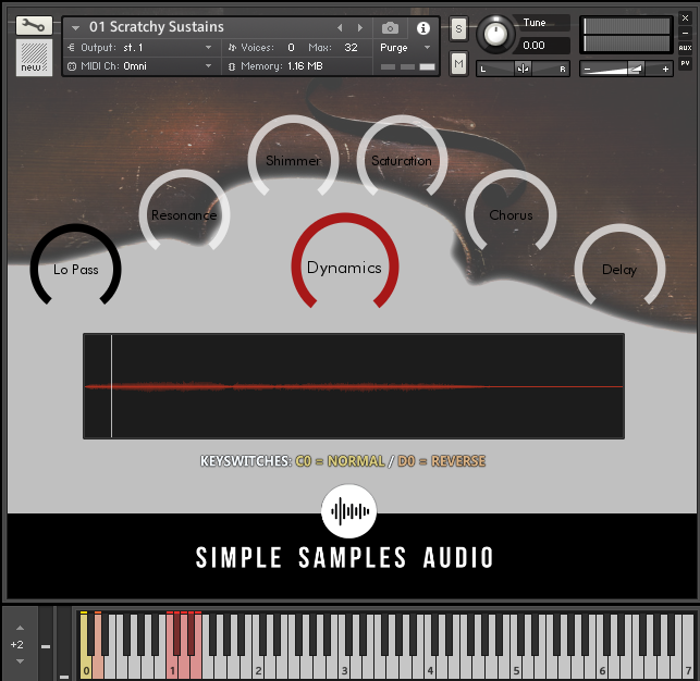 - 13 Patches: Scratchy Sustains, Spooky Sustains, Tremolo Bends, Double Tremolo Bends, Harmonic Sweeps, Bends, Chaos Stabs, Bartok Pizz, Hammer Pizz, Pressure Opens, Sul Tasto Opens, Wood Knocks, & Pizz Strum